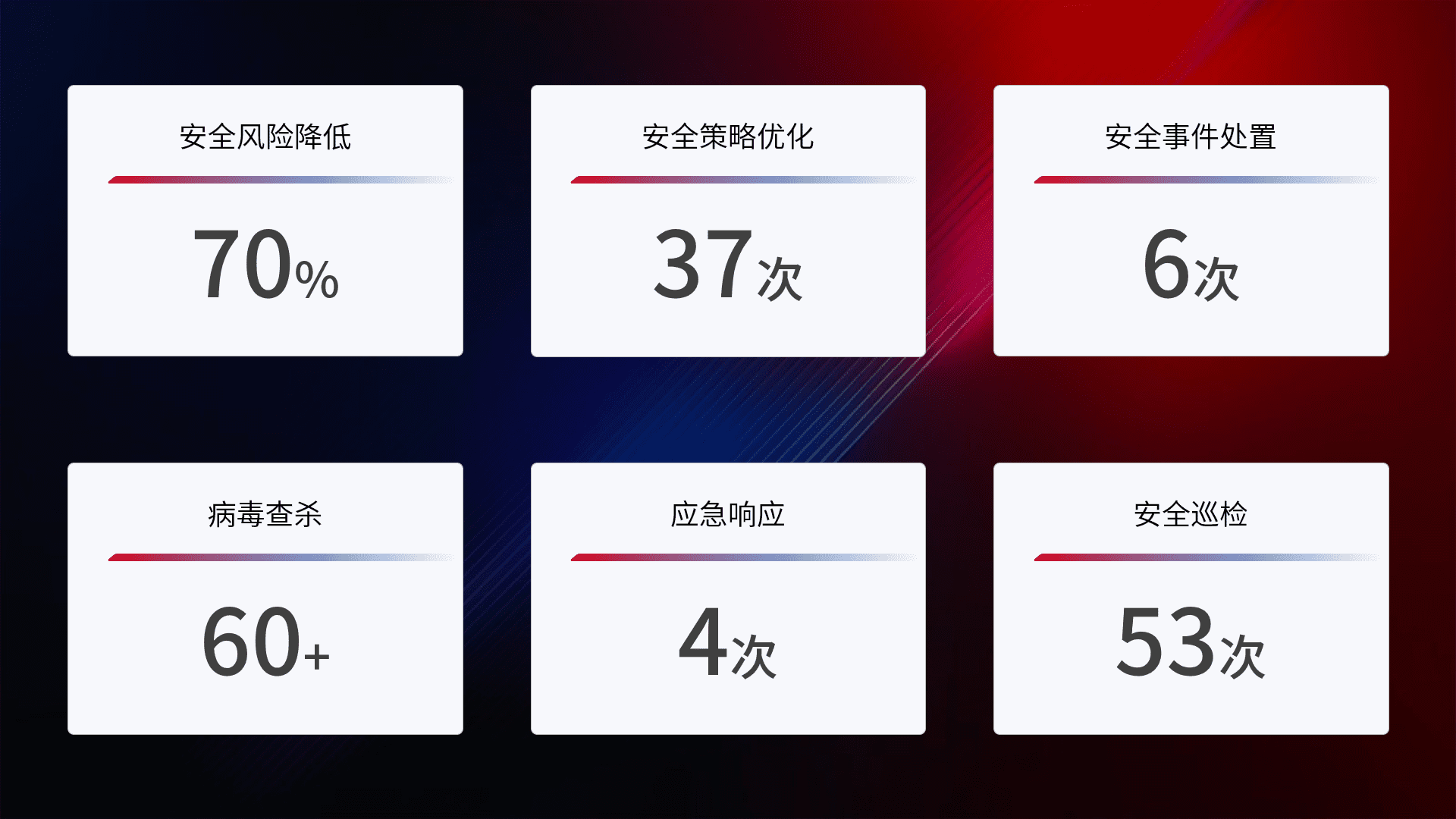 提供全面的安全事件报告体系,,,包括处置报告、、、周报、、季度和年度总结,,结合持续监控,,帮助客户深入了解网络安全状况。。。。